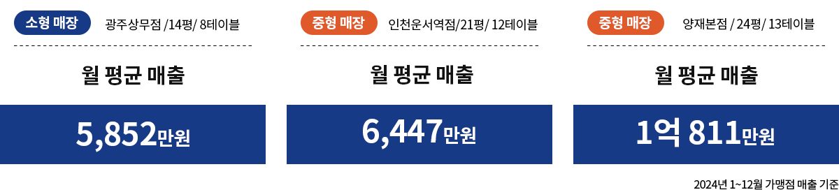 전문화된 점심 / 저녁 / 배달 운영으로 소형 매장에서도 높은 매출을 창출합니다.